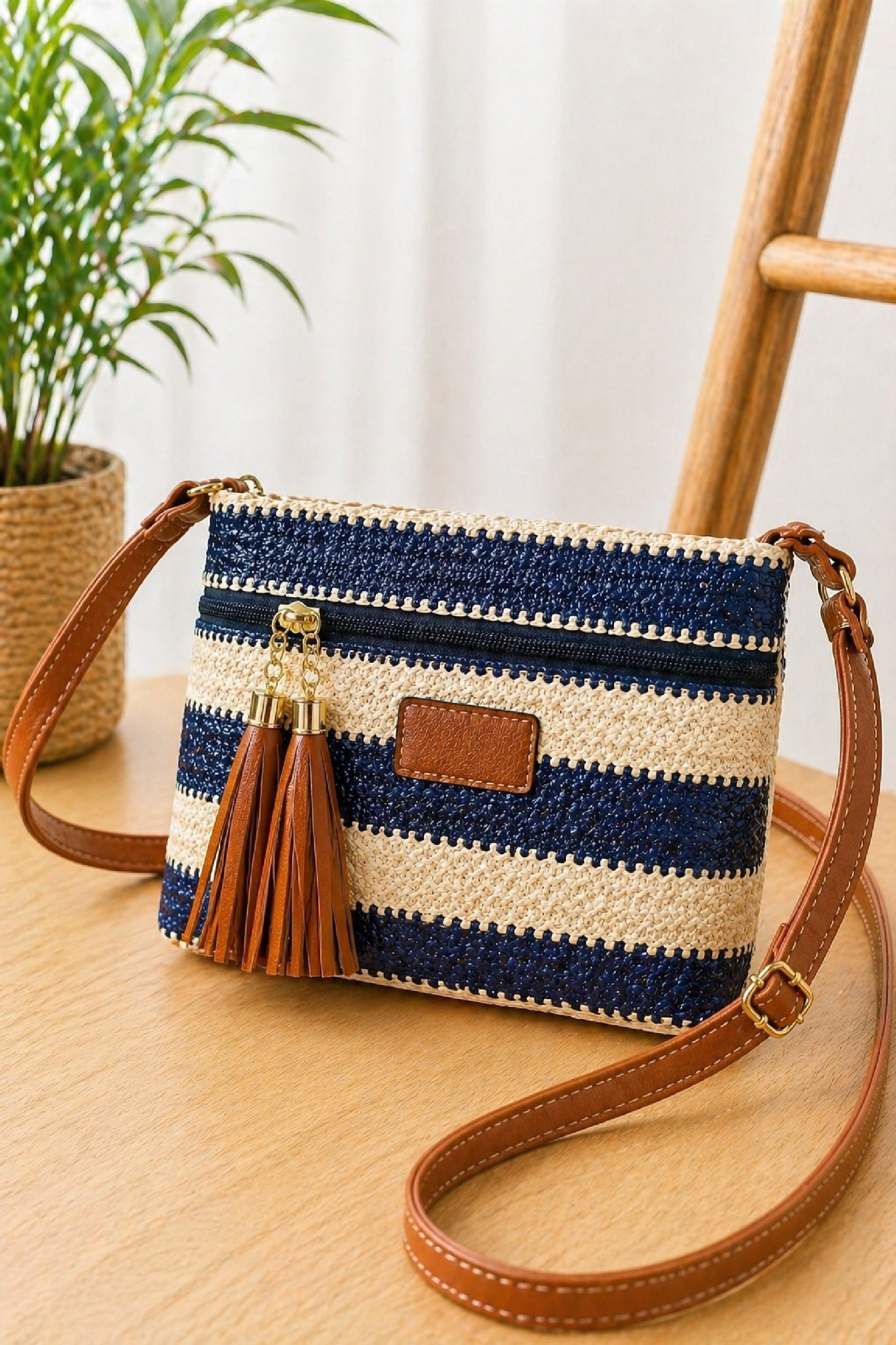 Bolso Rafia Rayas Azul. Complementos Ultima Tendencia.