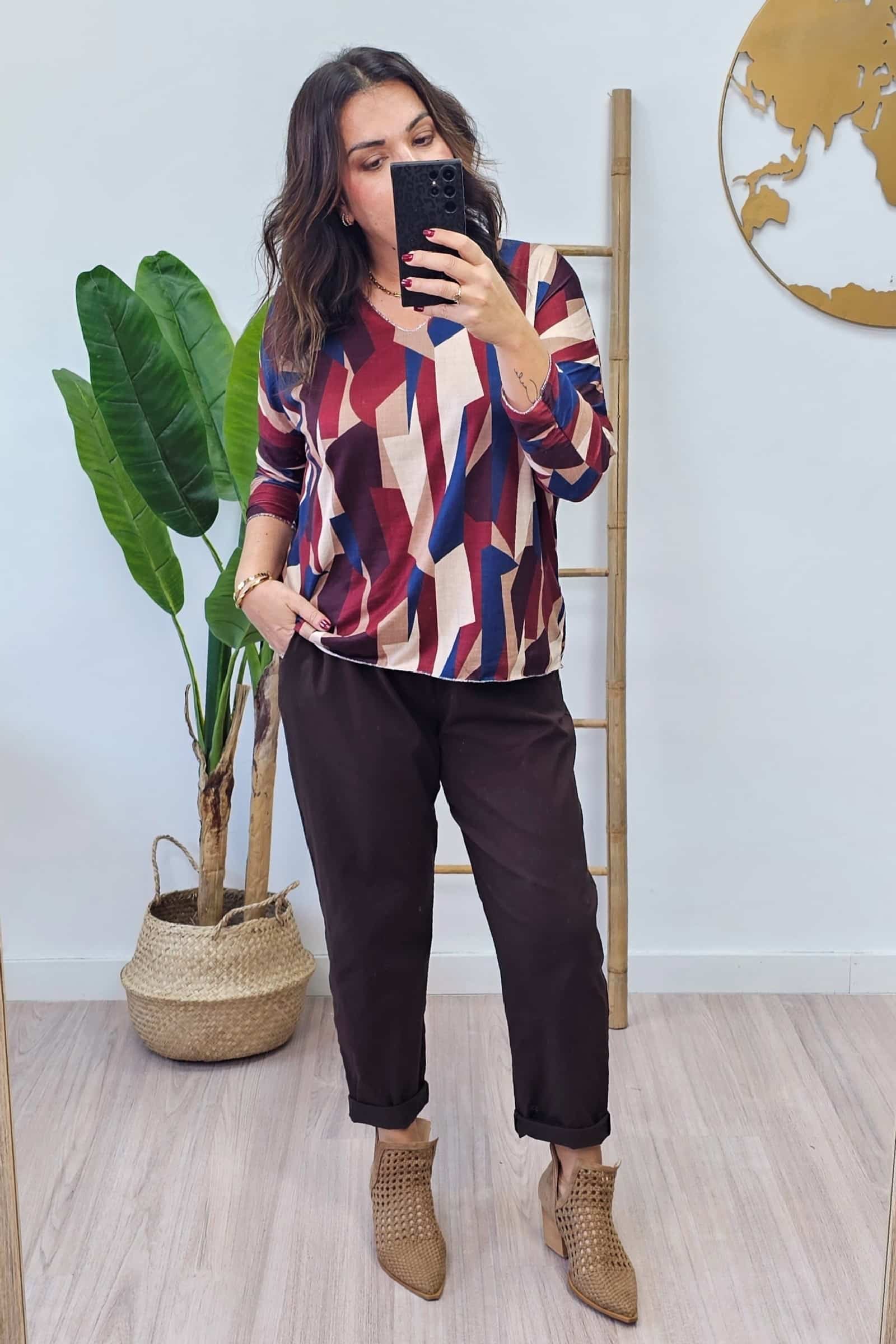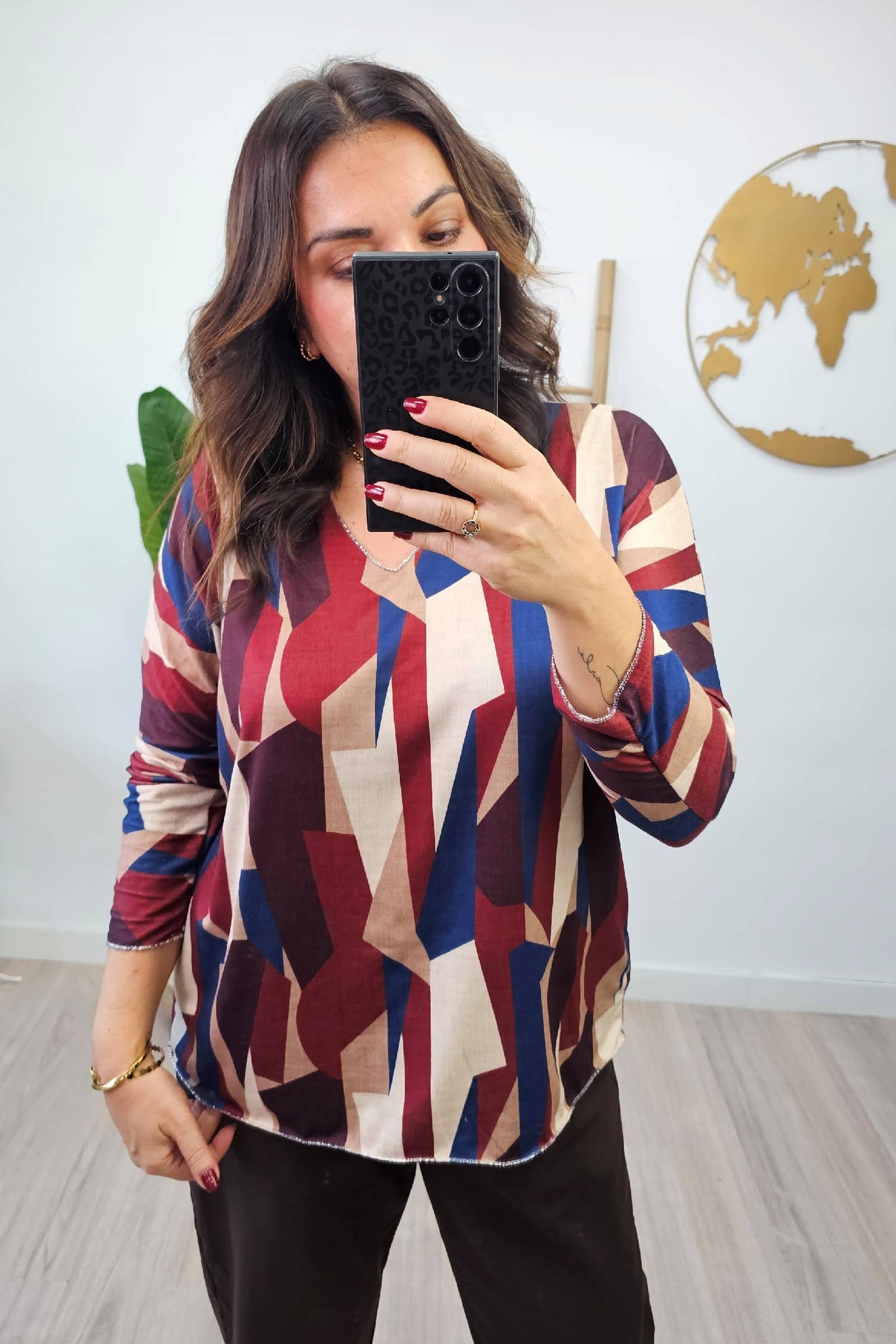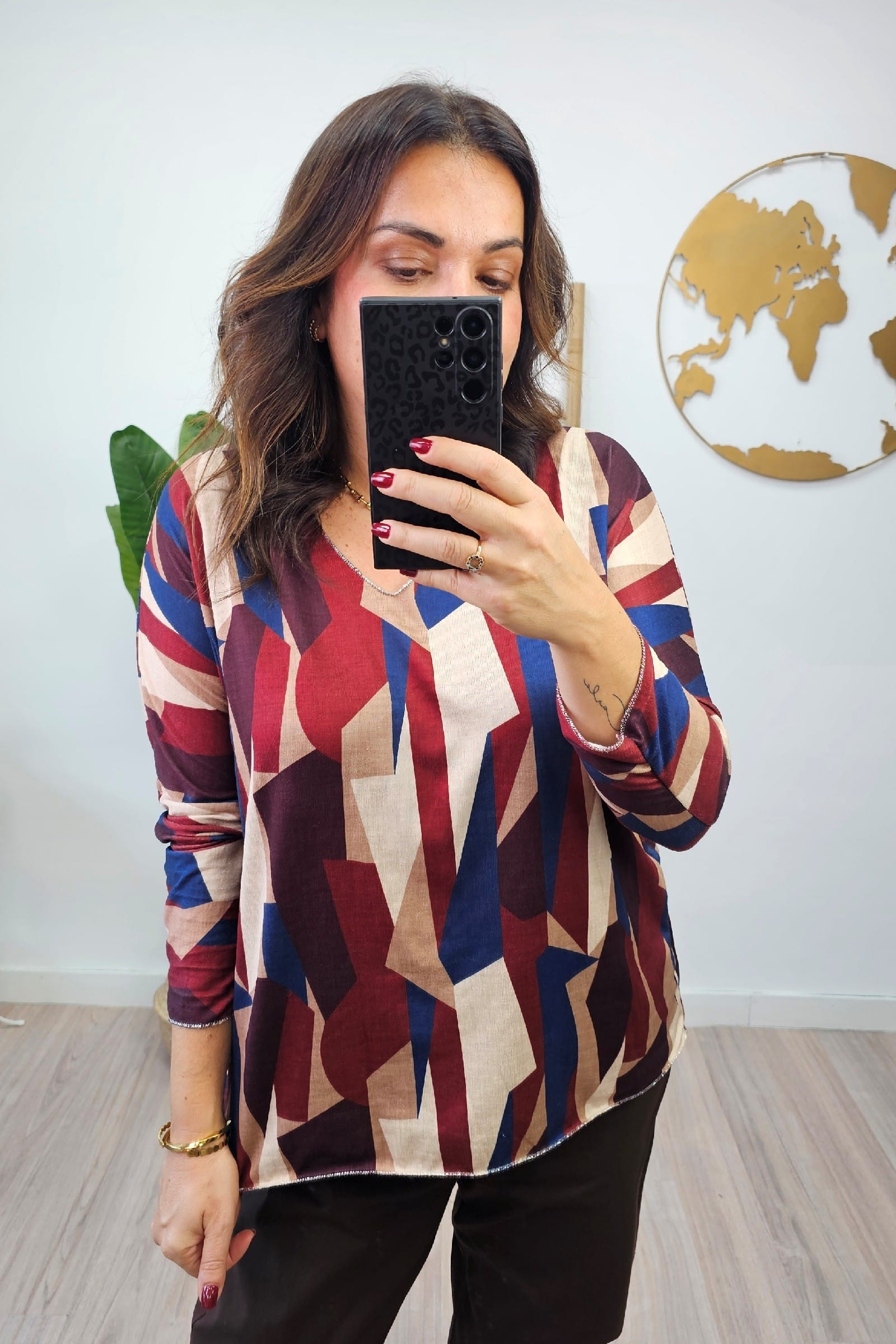 Jersey Fino Geometric Burdeos. Top Tallas Grandes.