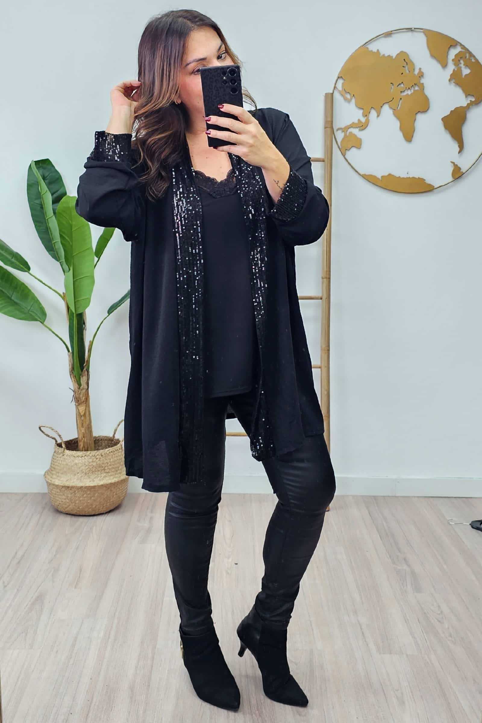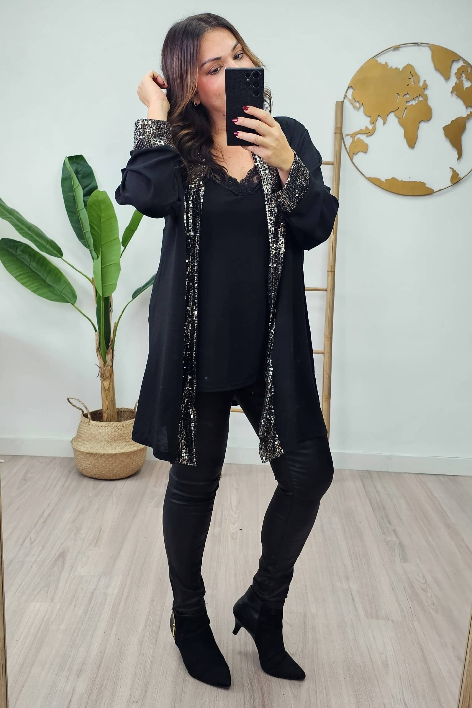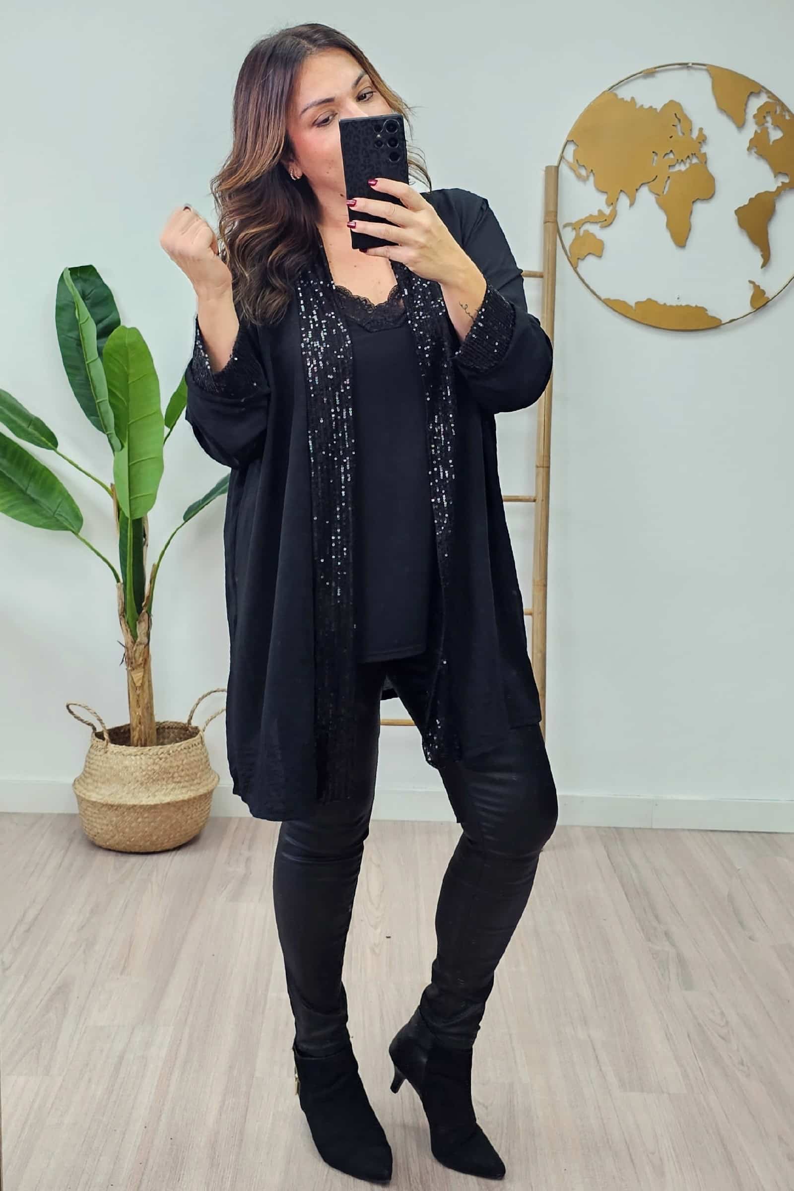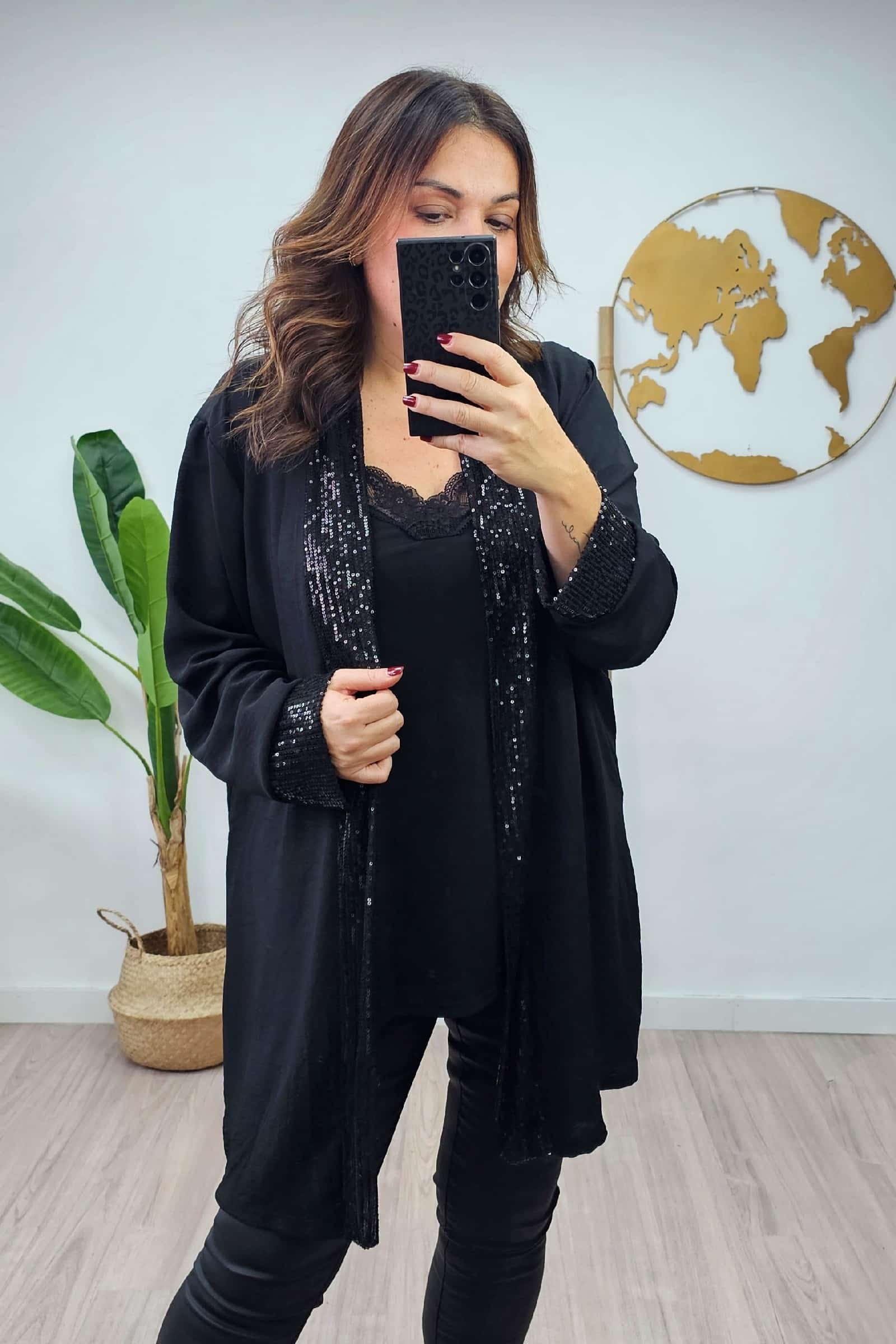 Kimono Largo Lentejuelas Negro. Chaquetas tallas grandes