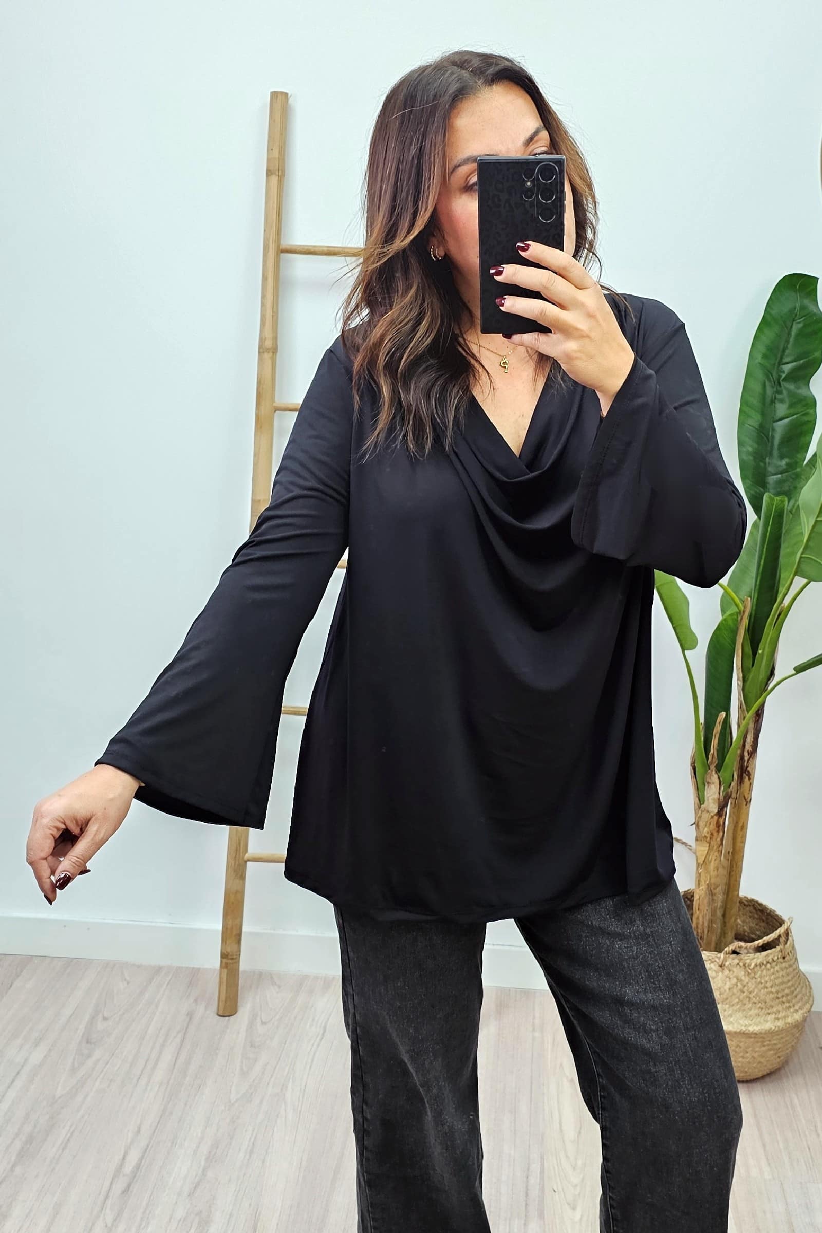 Top de punto con cuello tipo cascada y manga acampanada