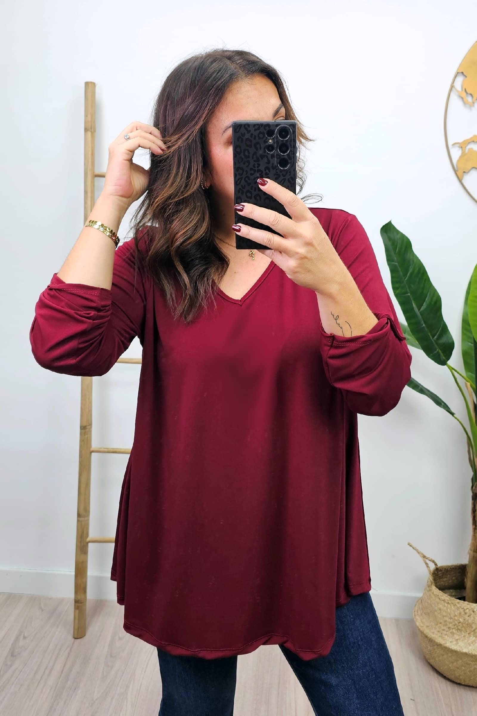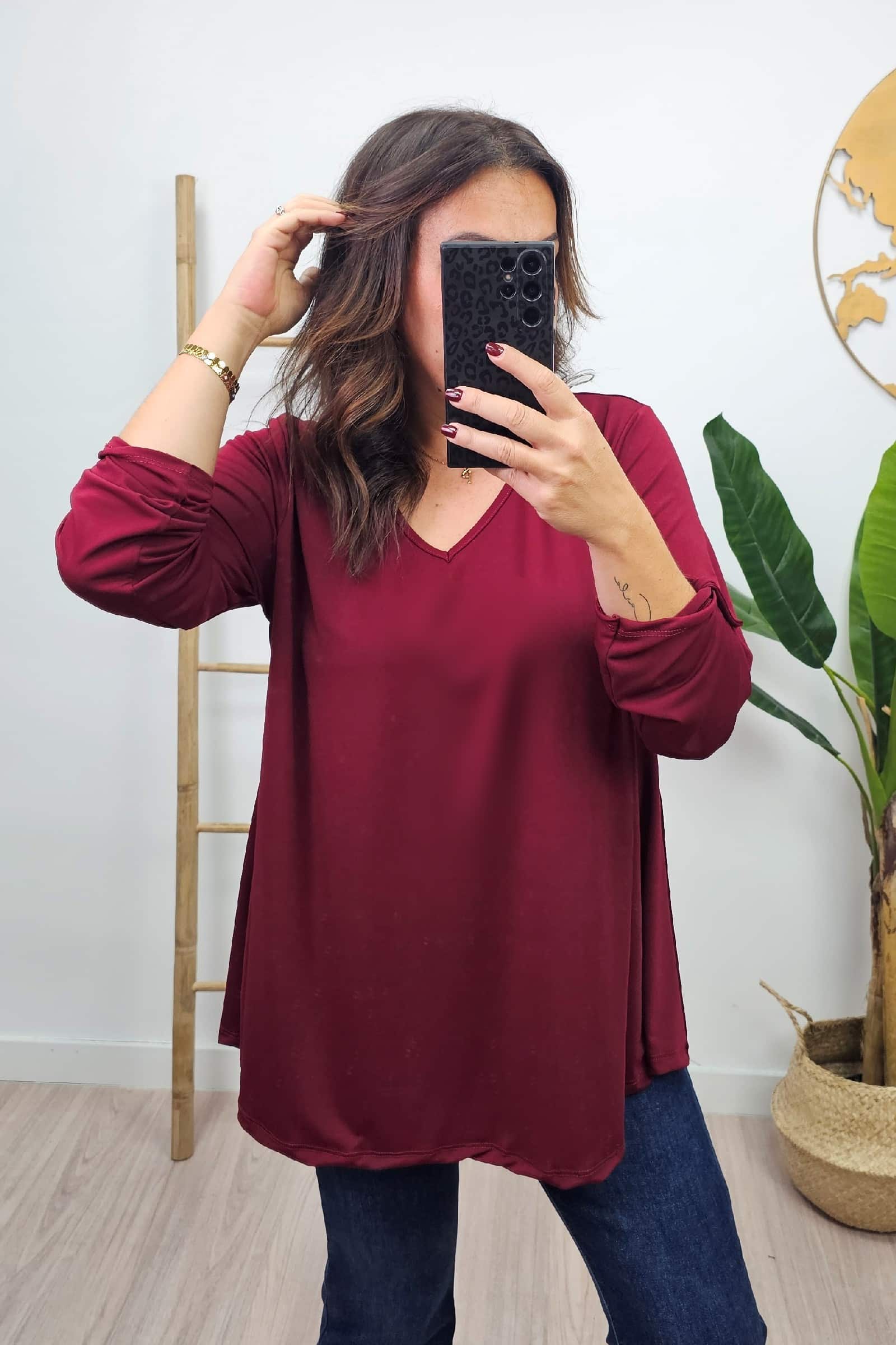 Si buscas moda Top Evase Plus Burdeosdiferente, actual y divertida en tallas grandes Corazon XL es tu tienda.