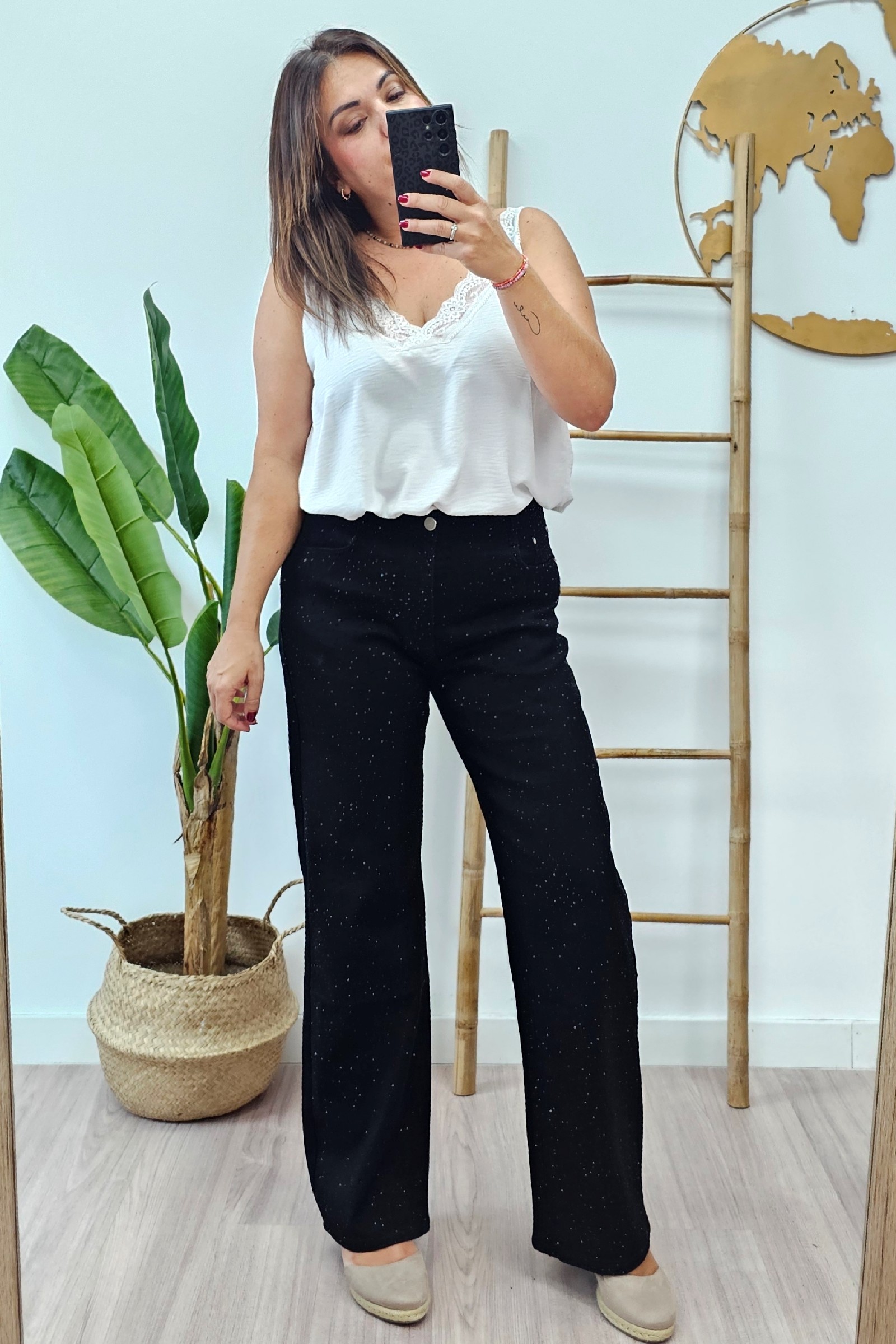 Vaquero tipo wide leg con strass. Recomendamos lavar a mano.